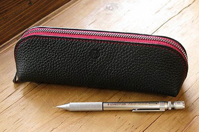 写真は、オンラインショップで販売中の黒いシュリンクレザーを使用したペンケースです。